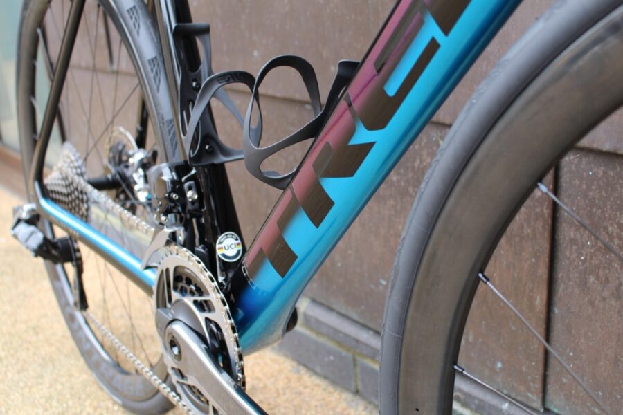 This is a 58cm frame with SRAM's AXS eTap wireless groupset with powermeter and the vaery are Bontrager RSL 37 wheels that weigh in close to 1300g. The bars and stem are Enve Aero to achieve the 40cm bar width and 120mm stem length unavailable in the Bontrager RSL version.
